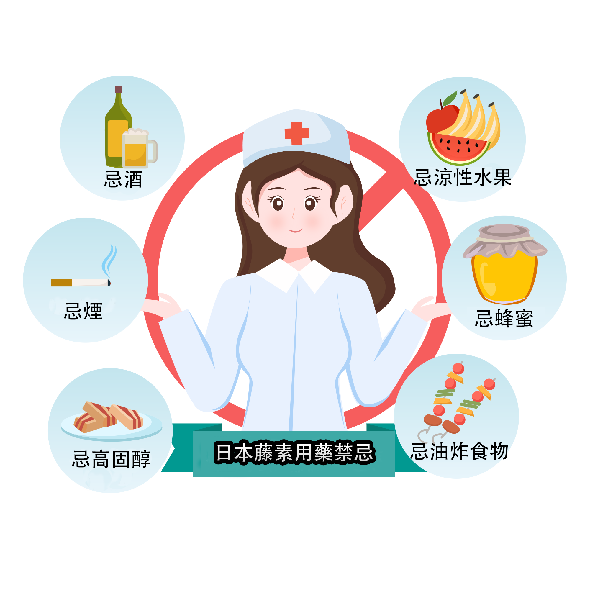 有些食物或酒水可能會和日本藤素發生交互作用,影響它的吸收和效果。醫生可能會提醒你們避免或限製攝入某些特定的食物,比如辛辣,油炸類的。在服用藤素1小時前,切忌飲酒。請仔細瞭解醫生的飲食建議,並且按照相應的指示去做。