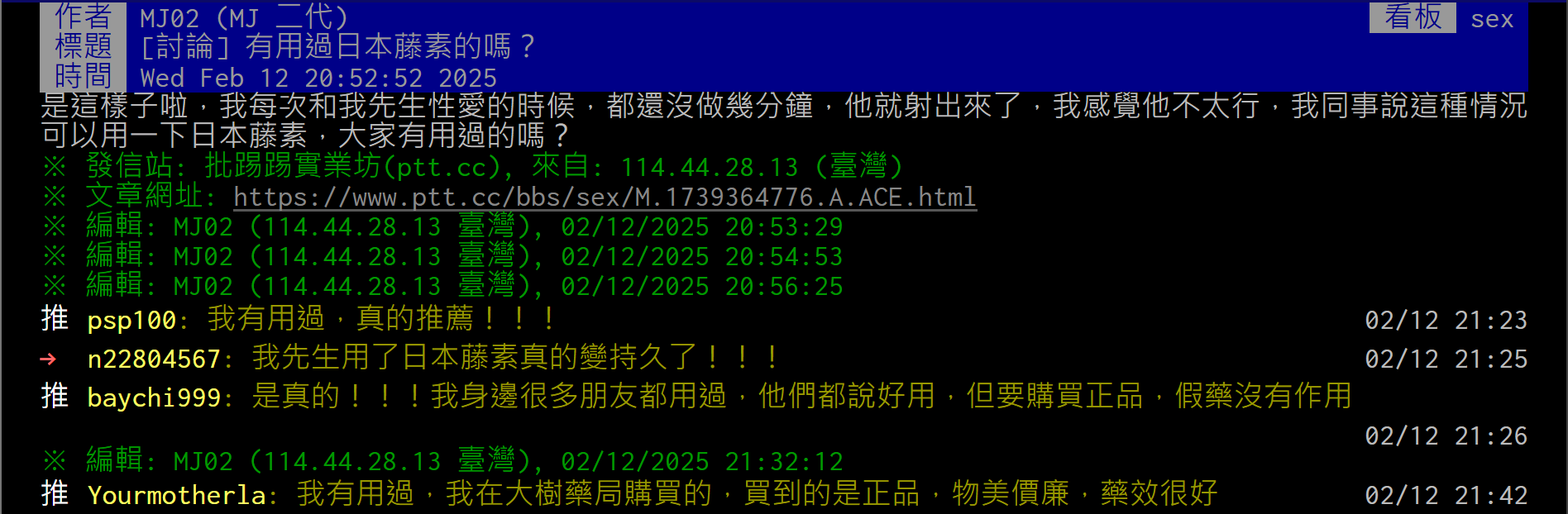 根據 PTT 網友的分享,許多人表示日本藤素的效果明顯,特別是在持久度與硬度方面。